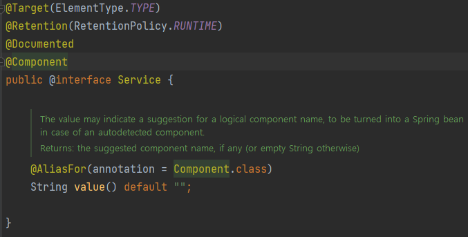 *** @Service 어노테이션 코드에서도 @Component를 확인할 수 있다. 따라서 @Service를 작성해주면 자동으로 컴포넌트 스캔을 해주어 DI를 해줄 수 있게 된다.