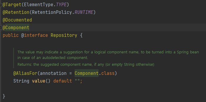 *** @Repository 어노테이션 코드에서도 @Component를 확인할 수 있다. 따라서 @Repository를 작성해주면 자동으로 컴포넌트 스캔을 해주어 DI를 해줄 수 있게 된다.