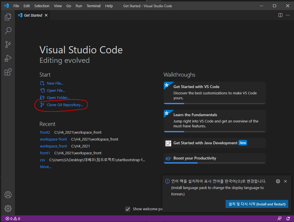 2. VSCode ์์ ํ๋ฉด์์ Clone Git Repository...๋ฅผ ๋๋ฅด๊ณ ์์