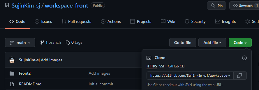 1. Github์์ Repository ๋ฅผ ์์ฑํ๋ค. ์์ฑ ํ Code ๋ฒํผ์ ๋๋ฅธ ๋ค ์ฃผ์ ๋ณต์ฌ