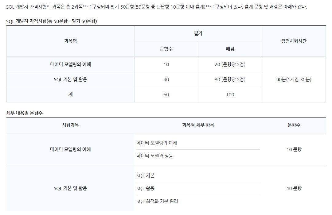 - SQLD๋ 2๊ณผ๋ชฉ SQL๊ธฐ๋ณธ ๋ฐ ํ์ฉ๊น์ง๋ง ํ๋ฉด ๋๋ค. (5p~136p